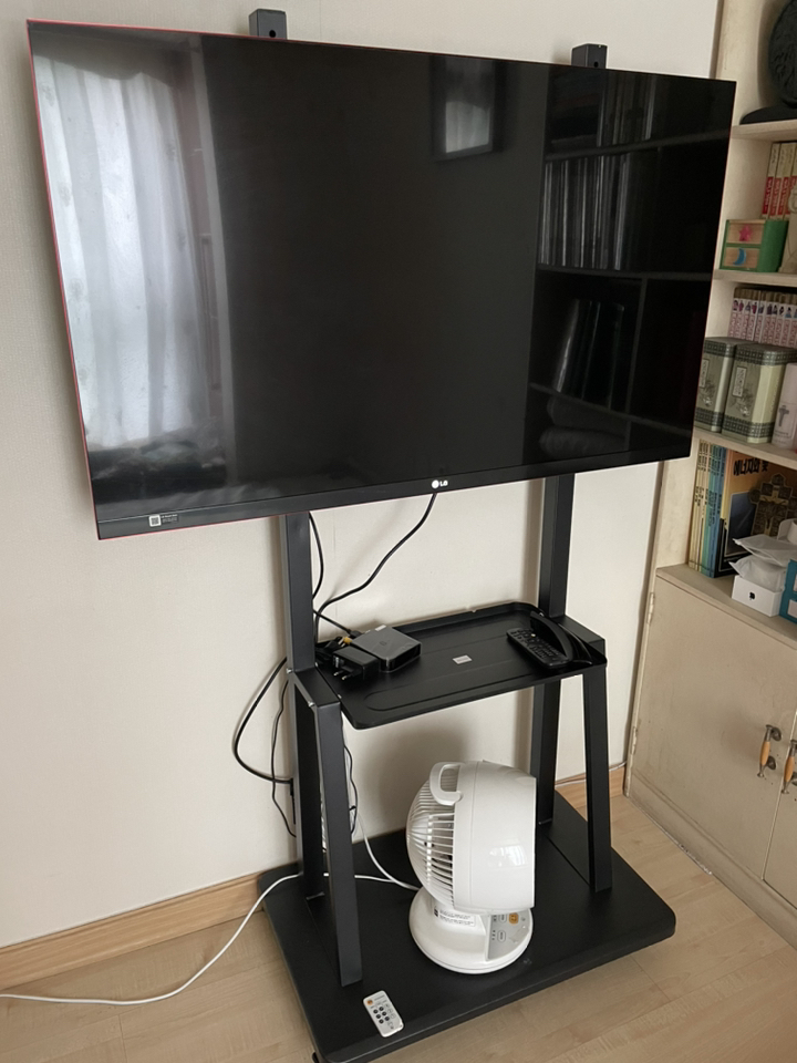 49인치 달았는데 튼튼하네요 셋탑박스 올리고 리모콘도 올릴수 있어 좋아요 바퀴가 달려있어 이동하기도 좋고 잠금 장치 있어요 가성비 좋은 제품 같습니다