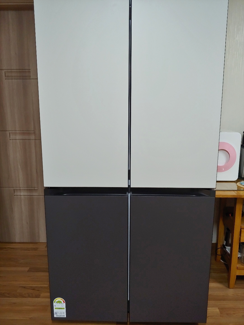 아직 사용전이여서 실제 실 사용후기는 못 쓰지만, 배송받고 보니 멋스럽네요. 670리터 사용하다 870리터를 맞이하니 거인같은 느낌이 듧니다. 아랫쪽 냉동고를 사용자가 여러 용도로 변경해서 사용할 수 있다는 점과 깊이가 깊은 냉장실이 장점이겠네요. 아이스메이커가 얼음 한 판만 만들어지는 구조라 그 점은 조금 불편합니다. 4도어인데, 실제 냉장고 야채박스를 꺼내려면 윗쪽 도어 두 개를 모두 열어야 하기에 실제는 3도어같은 사용감도 듧니다. 가족이 많지 않은 집이라면 615리터 세미빌트인 냉장고가 더 나을 것 같아요.