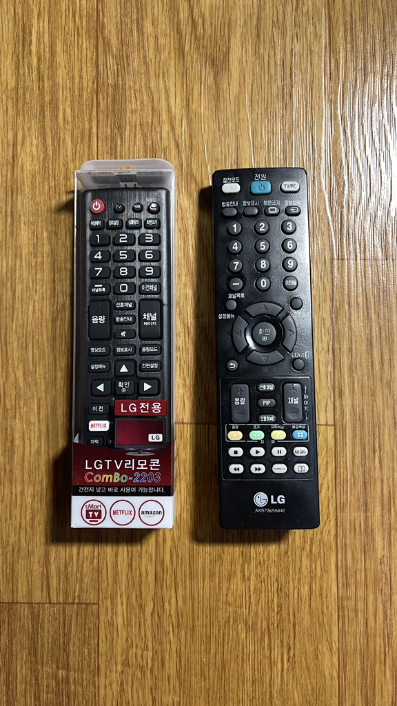 후기에 비교사진도 같이 올립니다. 좀더 길고 버튼 위치가 좀 다른게 제방에서 사용중이었던 티비모니터 리모콘... 드레싱 듬뿍 먹은 엘지 오리지날 리모콘이고요.