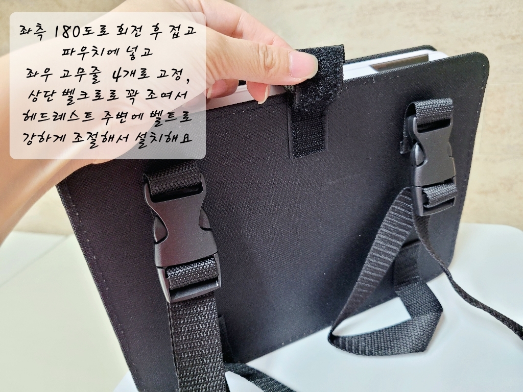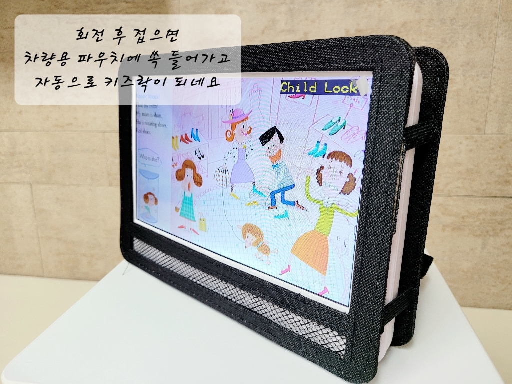 블루라이트 차단 액정필름도 싸구려 아니고 저도 애용하는 힐링쉴드제품이고 차량용 거치대도 사진처럼 좌우 고무줄 네개가 딱 잡아주고 뒤 고정벨트도 짱짱해요. 그리고 왼쪽 180도로 회전해서 접을 때 자동으로 차일드락이 걸려서 오작동할 걱정도 없고 노래만 들을 때는 화면꺼짐 메뉴도 있어서 배터리도 아낄 수 있어요. 차에서 장거리 이동할 때 인터넷 요금 걱정 없이 영어나 노래CD 챙겨놨다가 보여주기 너무 좋을 것 같아요~
