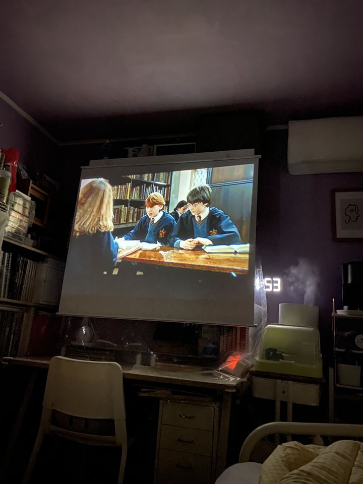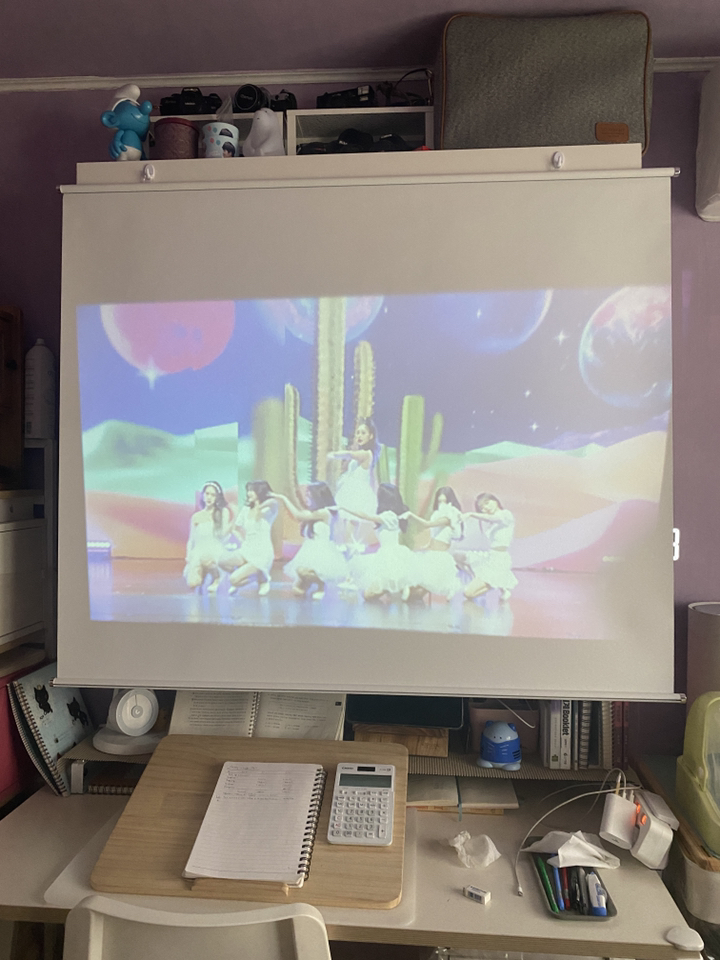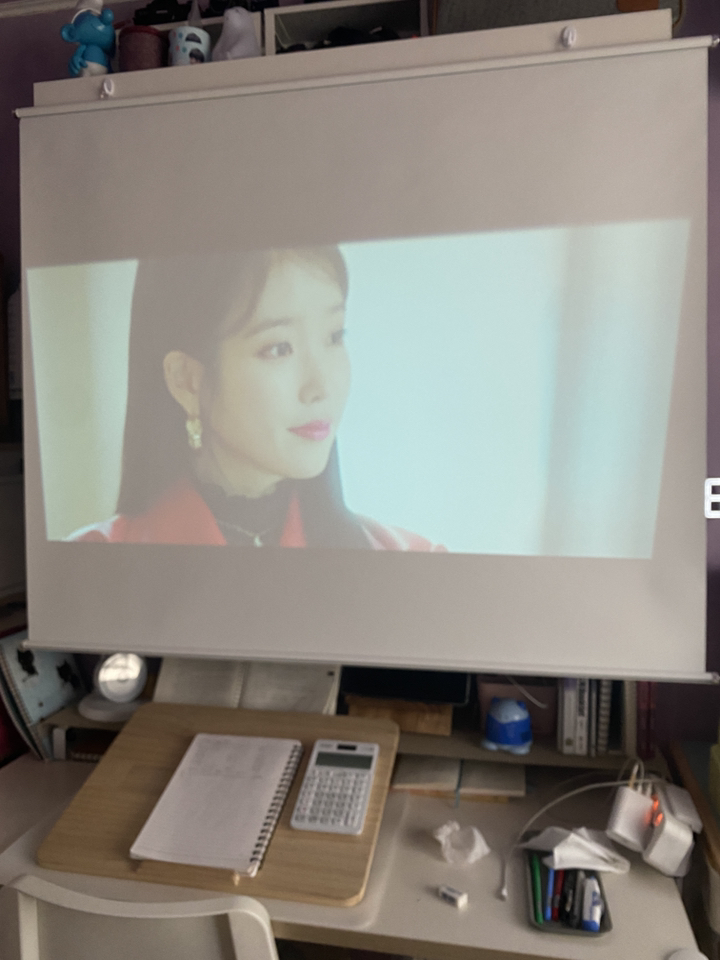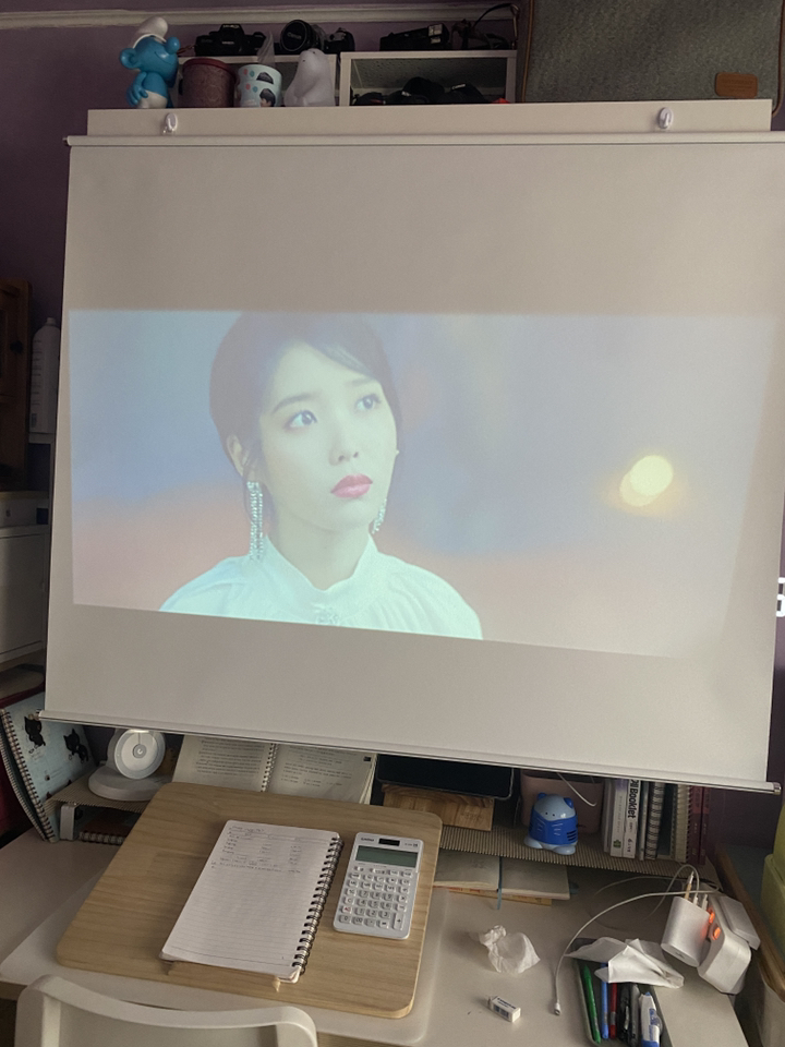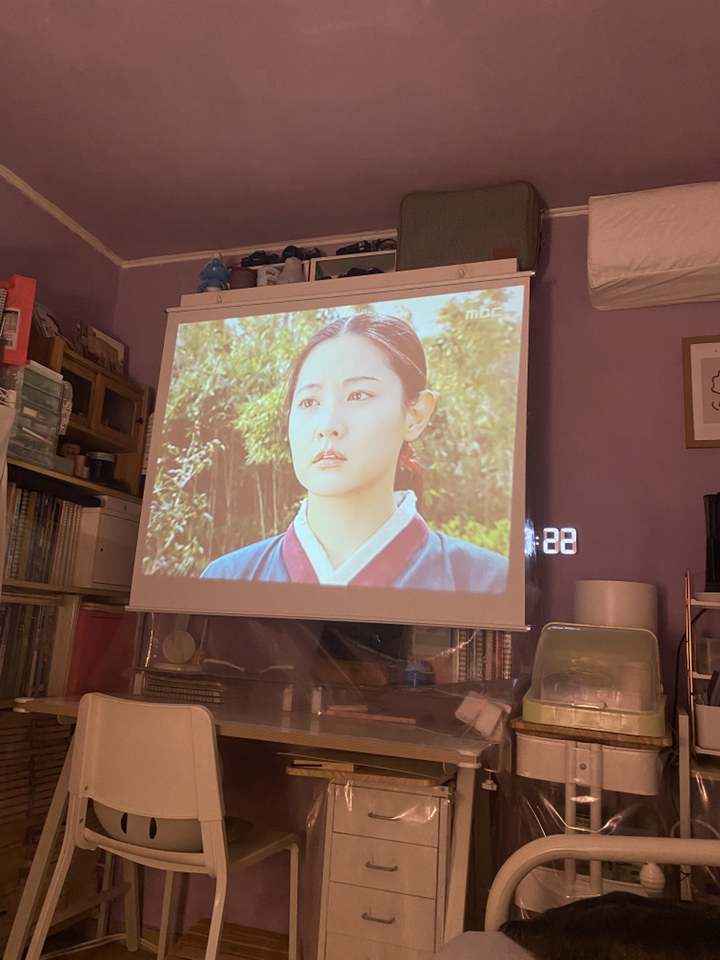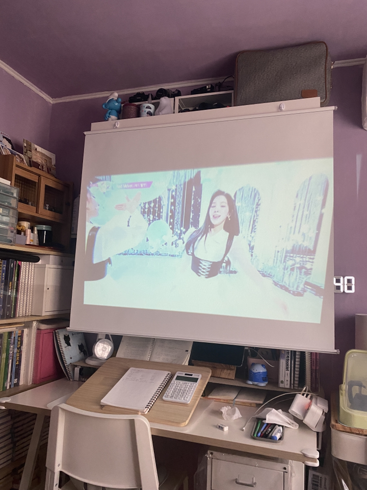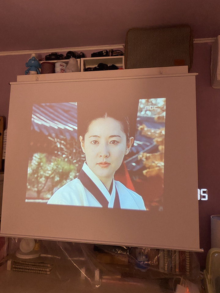 저는 스크린에다가 쏴서 보는데 스크린에 쏴서 보는 걸 추천드려요 불을 다 끄면 훨씬 더 잘 보이는데 저는 스탠드 조명 하나 켜서 보는대도 문제 없어요 배송은 정말 늦었지만 제품은 너무너무 만족합니다