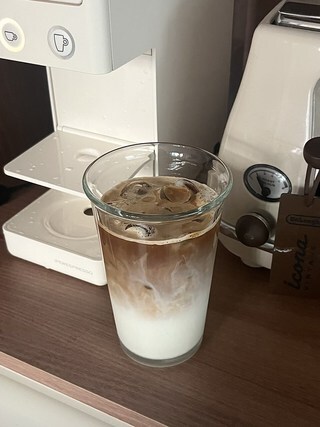 진하게 마시는 걸 좋아해서 “라떼 레시피 : (캡슐 1개 기준) 우유 80ml + 시럽 1번 + 얼음 가득”해서 마셔요.
