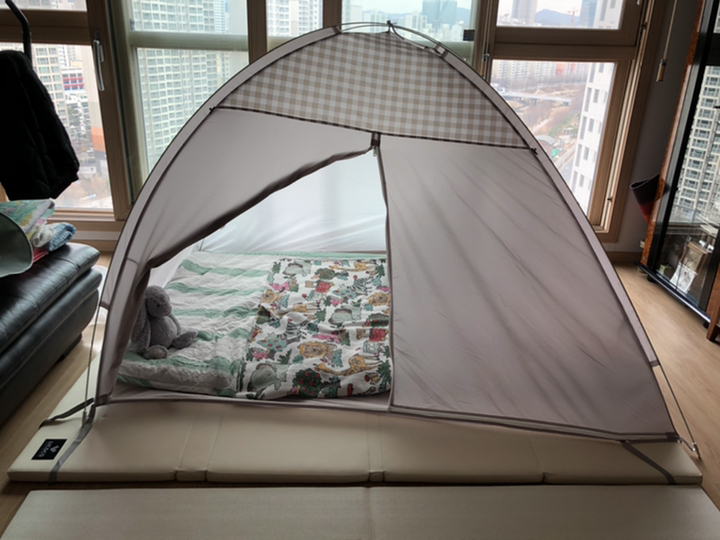 아기랑 거실에서 자려고 구매했어요~ 저는 우풍때문에 산것보단 아기가 잘때 돌아니지 않게 하기위해 울타리 역할도 할겸해서 샀어요~ 처음 받아서 설치했을때 밑바닥이 뚫려있어서 당황했지만 어차피 매트위에서 이불깔고 사용하니까 상관없더라구요^^ 실내용이라서 밑바닥이 뚫려있나봐요 ㅋㅋ 양 모서리에 끈이 있어서 저는 매트밑에 끼워서 고정했더니 딱 좋네요 ㅎㅎ 포켓도 두군데 있는데 저는 큰 포켓에는 물티슈 항상 넣어두고 핸드폰도 넣어두구요, 작은 포켓은 분유통 넣으니까 딱이에요! 매트위에 설치해 놓고 이불깔고 사용하니까 아늑하고 폭삭폭산한게 정말 좋아요 ㅎㅎㅎ 감성충만한 남편도 캠핑느낌나는지 가끔 안에 들어가있어요 ㅋㅋ 천장에는 조명도 달수있게 고리가 있더라구요^^ 저는 취침용이라 사용은 안하지만 이 가격에 이정도면 대만족입니다!^^